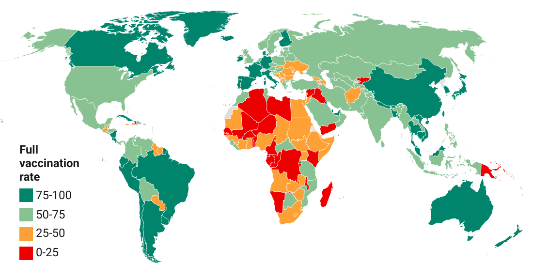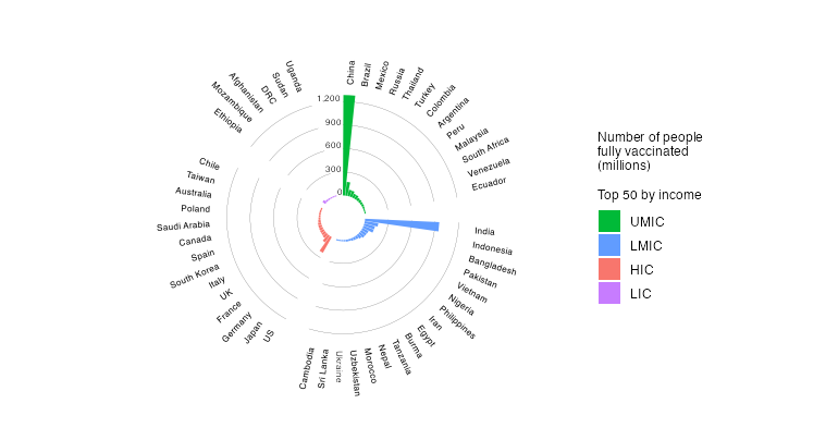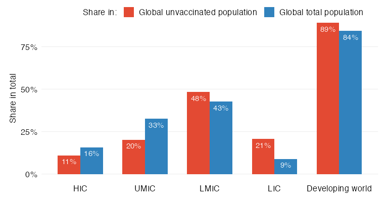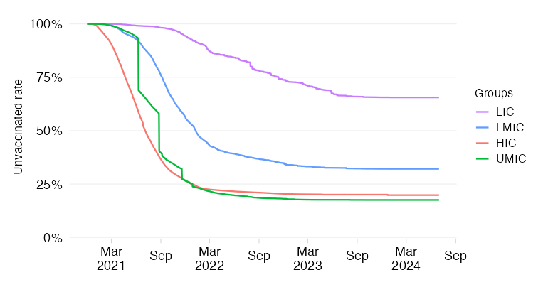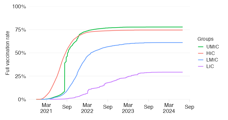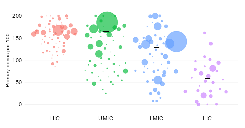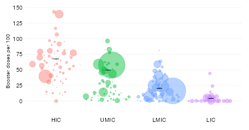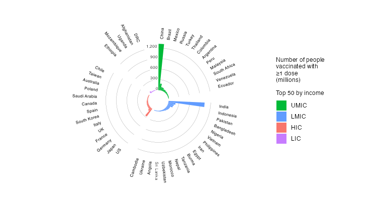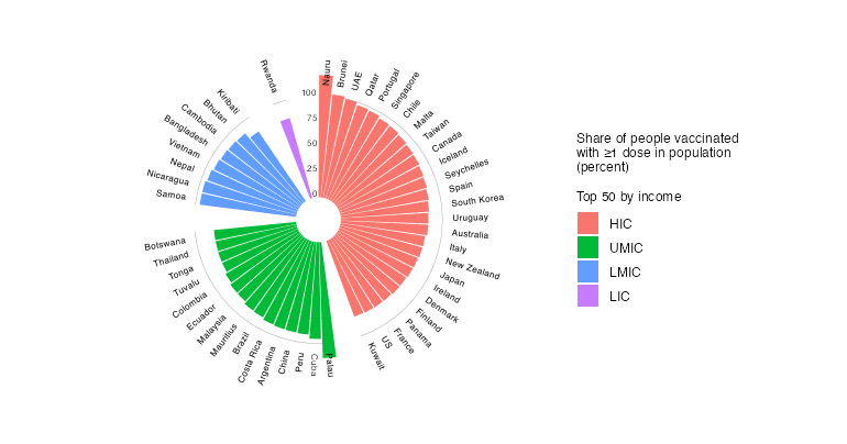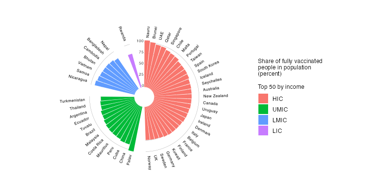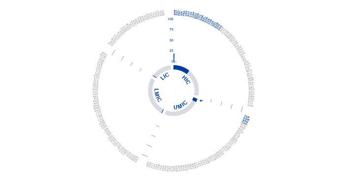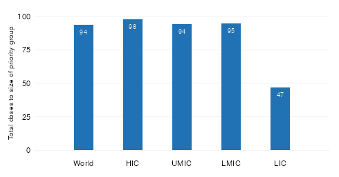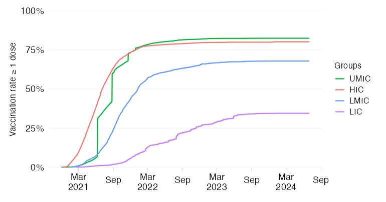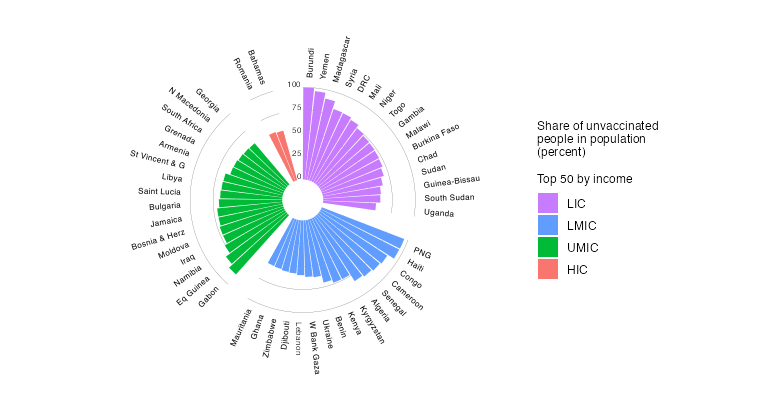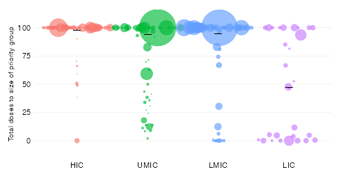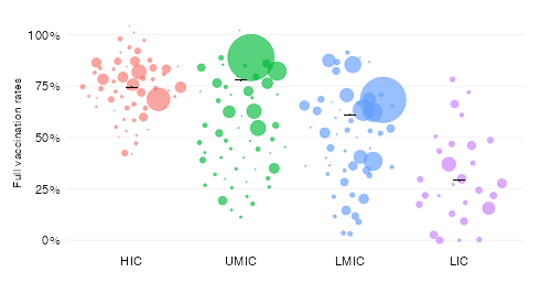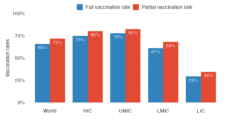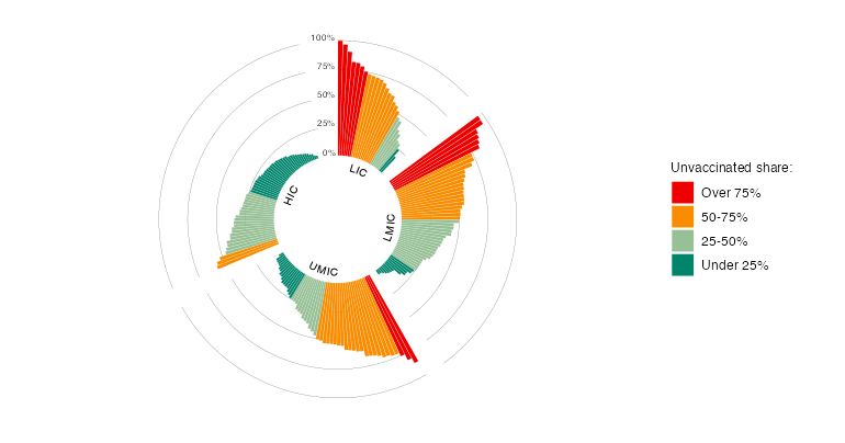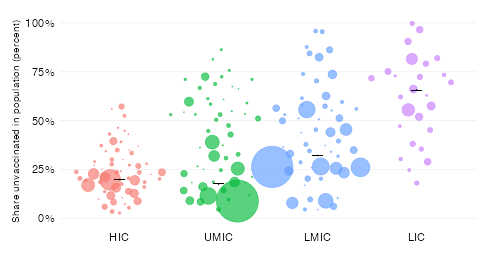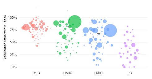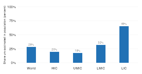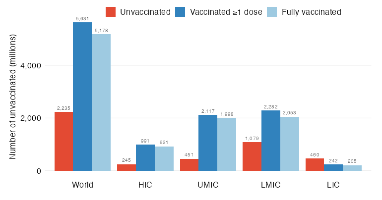 How well are countries rich and poor vaccinated against COVID-19? These trackers assess progress by World Bank country income group across three dimensions: people (people vaccinated and unvaccinated), doses (vaccine coverage, sufficiency and distribution) and countries (participation in vaccination).